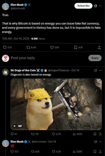 O bilionário voltou a destacar que o modelo de consenso baseado em energia torna o Bitcoin mais resistente à manipulação governamental e, ao ser lembrado por um seguidor de que o Dogecoin compartilha o mesmo princípio, ele concordou. Bastou essa breve interação para reacender o chamado “efeito DOGE Father”, fenômeno que há anos faz o Dogecoin reagir de forma imediata às falas do empresário.